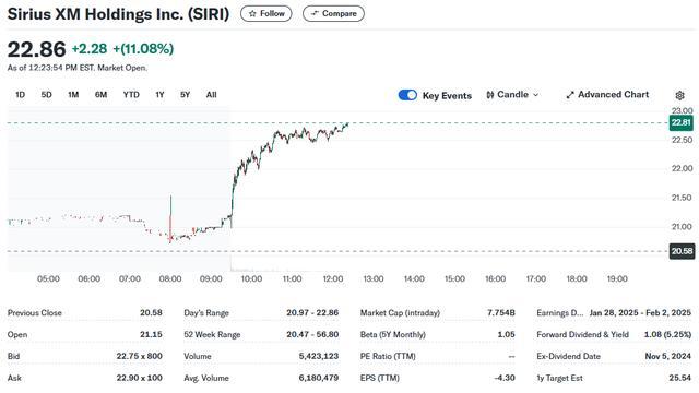 周五美股盘中,Sirius XM一度涨超10.7%。